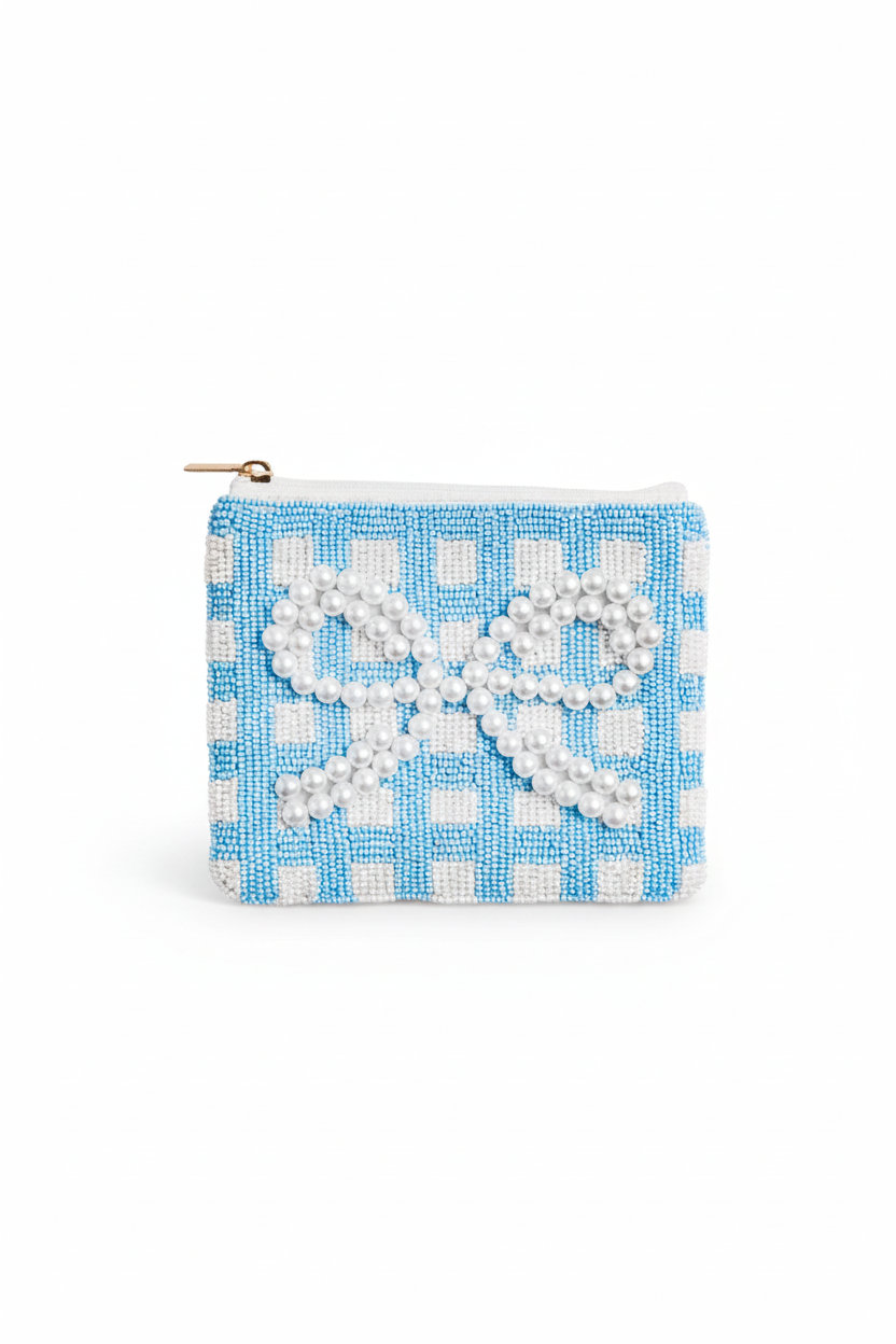 Charming and stylish, this Blue Gingham Bow Beaded Pouch is a delightful accessory for any occasion. Meticulously hand-beaded, it showcases intricate craftsmanship that adds a touch of elegance to your everyday essentials. The iconic zipper closure ensures your belongings are secure, while the lined interior provides a soft, protective space for your items. Measuring 4 1/2" x 5 1/2", this pouch is perfectly sized for carrying small essentials like keys, cards, or cosmetics. Made from 100% cotton, it offers durability and a soft texture, making it a practical yet fashionable choice for those who appreciate quality and design. Whether used as a standalone accessory or tucked inside a larger bag, this pouch is sure to make a statement.