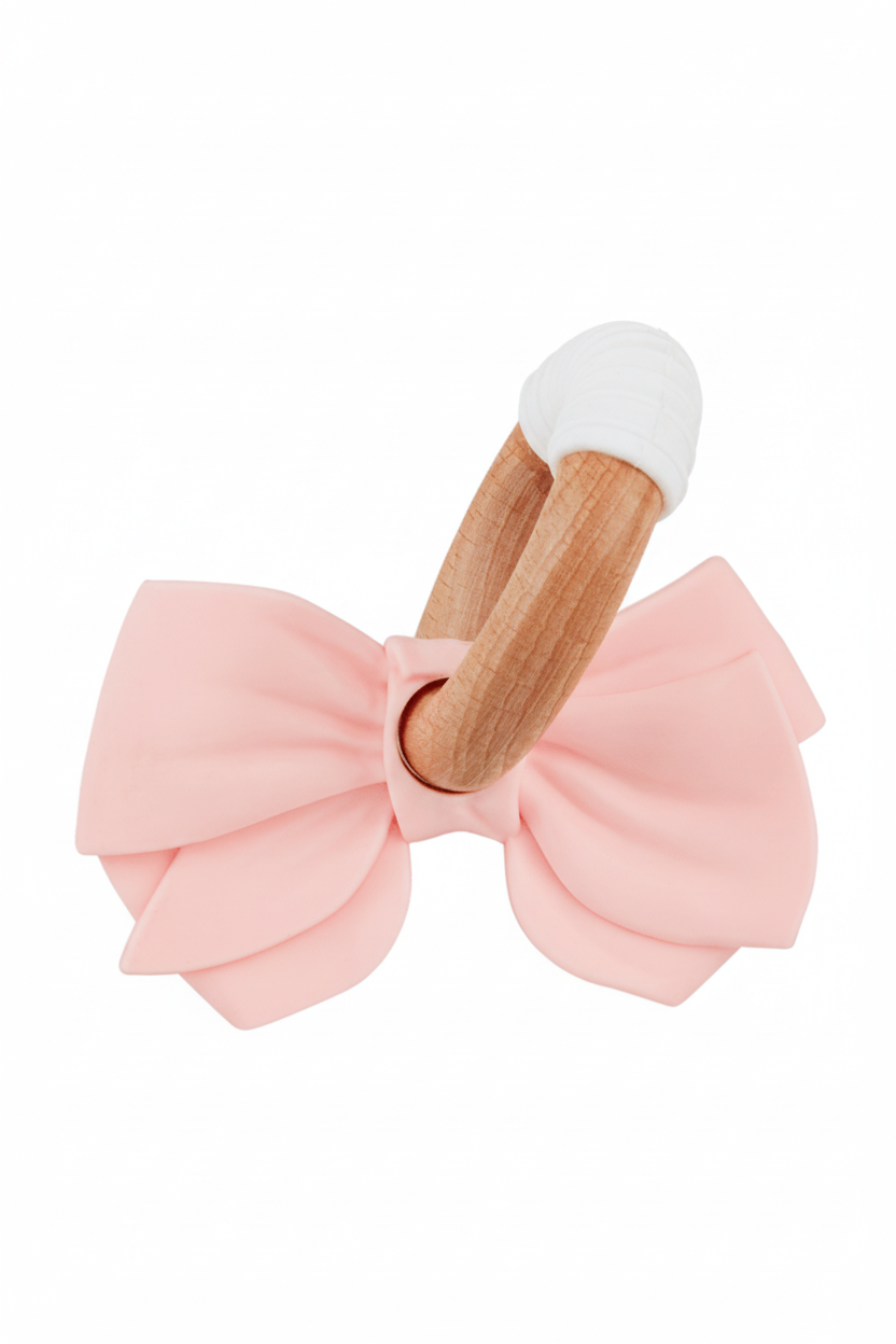 Pink bow silicone teether with wooden ring and white grip