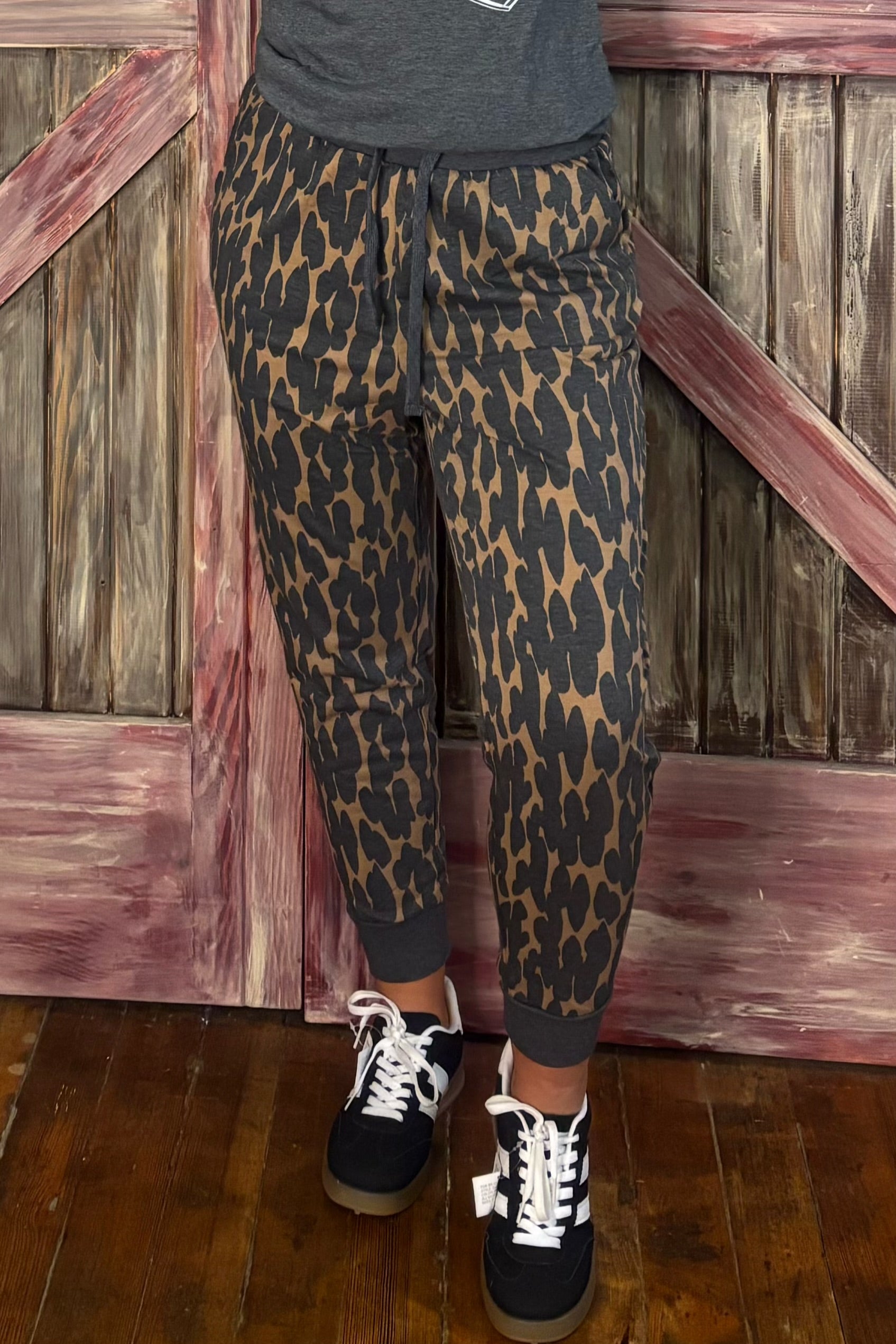 Person wearing leopard print pants and black sneakers in front of a wooden door.