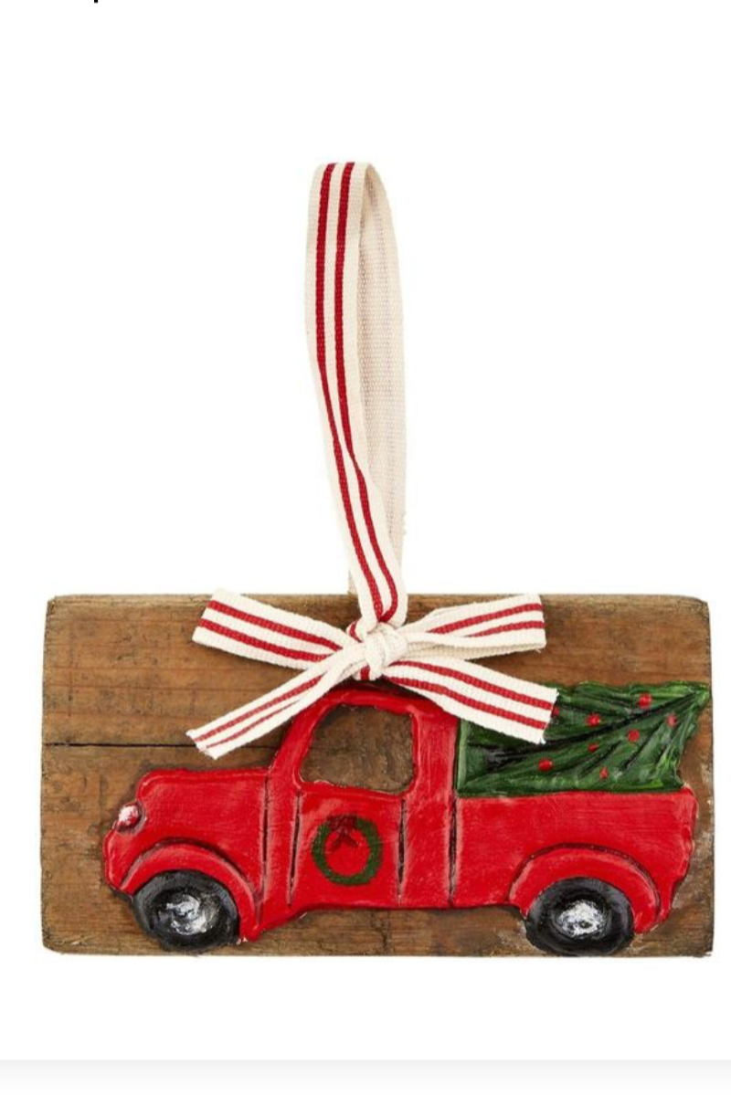 Add some quirky charm to your tree with this hand painted MudPie ornament of a red truck on a wood base. Includes a festive red striped ribbon for hanging. Perfect for the holiday season!