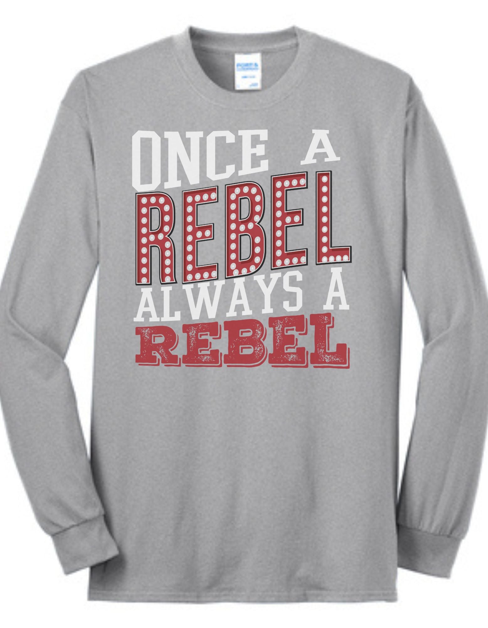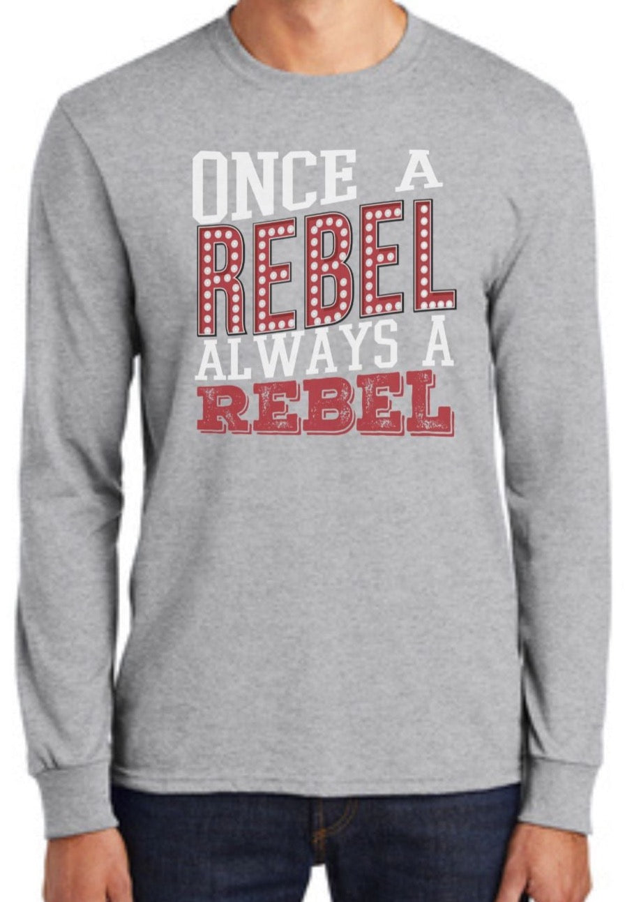 Show your Rebel pride with this "Once A Rebel, Always A Rebel" Shirt. Available in Long Sleeve Tee, Short Sleeve Tee, and Sweatshirt. This is a made to order item so the turnaround time will be two business days for in stock sizes.