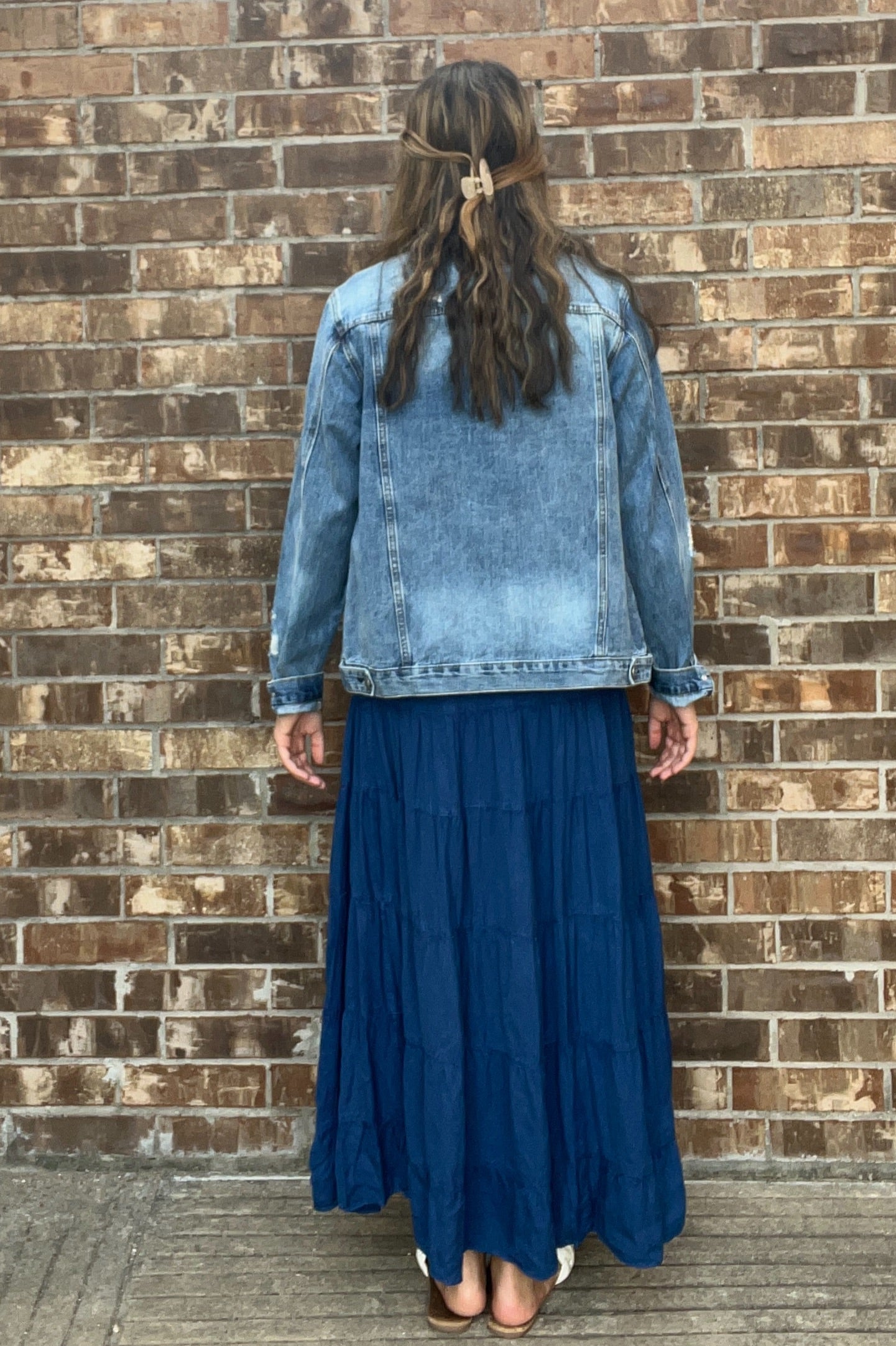 Effortlessly chic, the Willow Skirt is a must-have for any trendy wardrobe. Made with lightweight denim, this tiered skirt falls gracefully to the ankle. The smocked waist adds a touch of bohemian charm, making it perfect for any occasion. Dress it up or down for a versatile and playful look.