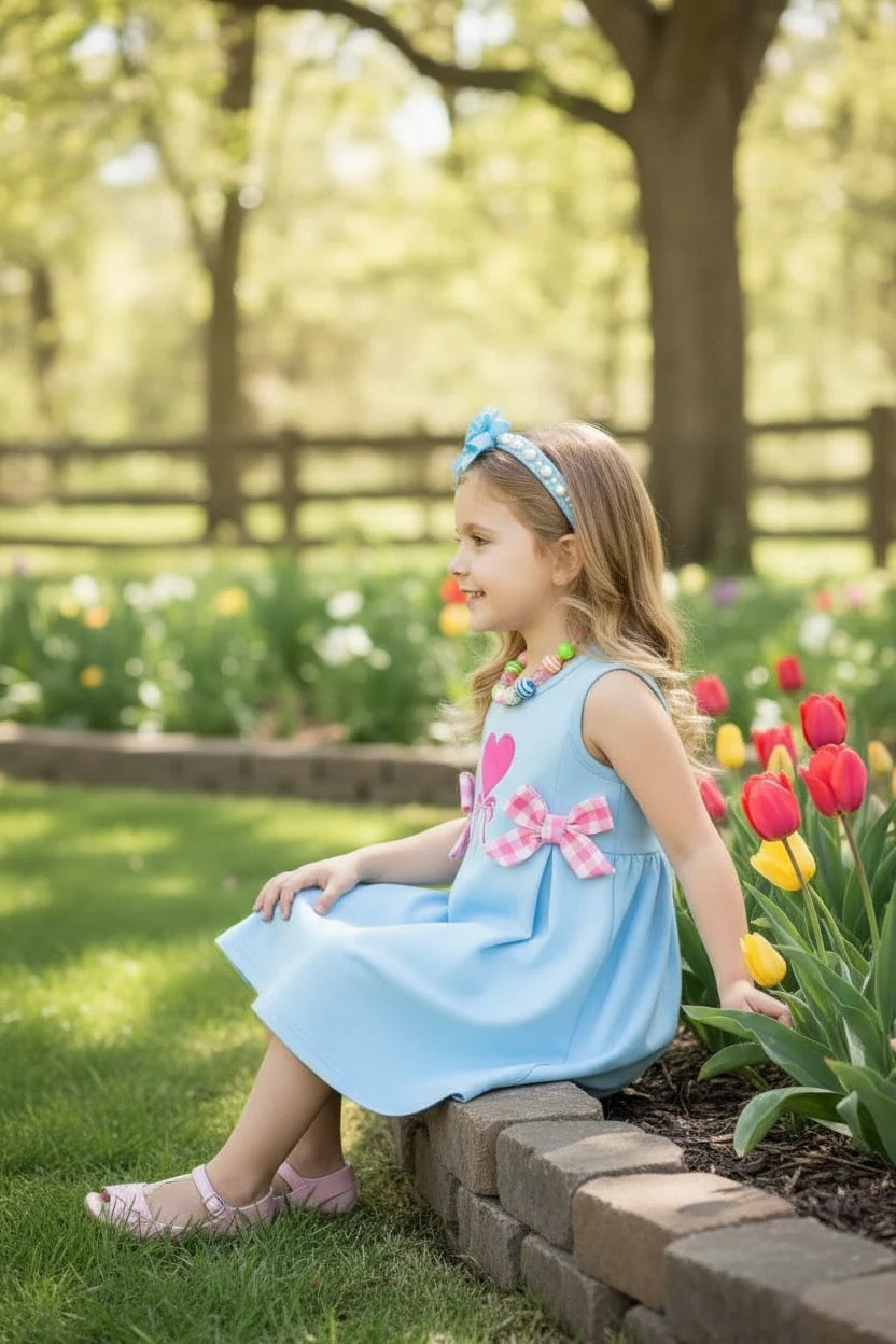 The Adorable Heart Strings Girls Dress features a lightweight design in a soft light blue fabric, ideal for warm weather. The sleeveless style and round neck enhance comfort, while pink gingham bows and a pink heart add charming accents. This dress provides ease of movement, suitable for active play.