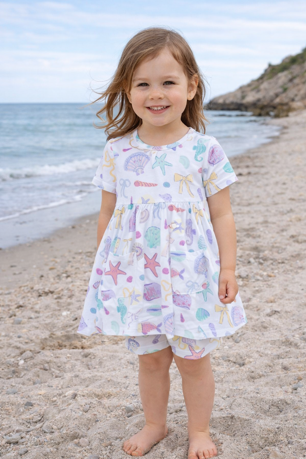 Young girl in a beach-themed dress standing on a sandy beach with ocean in the background