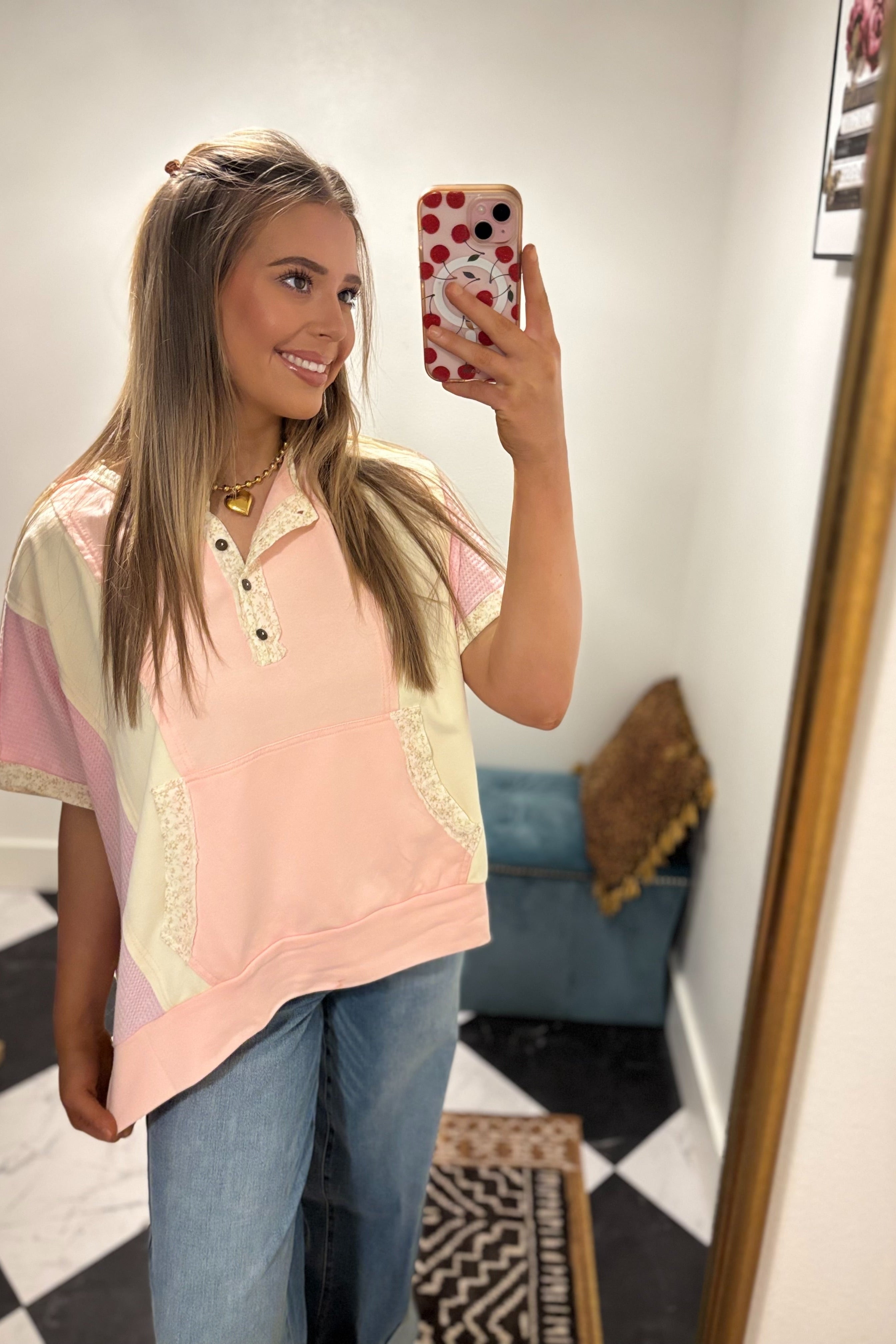 Woman taking a mirror selfie wearing a pink and beige top with lace details.