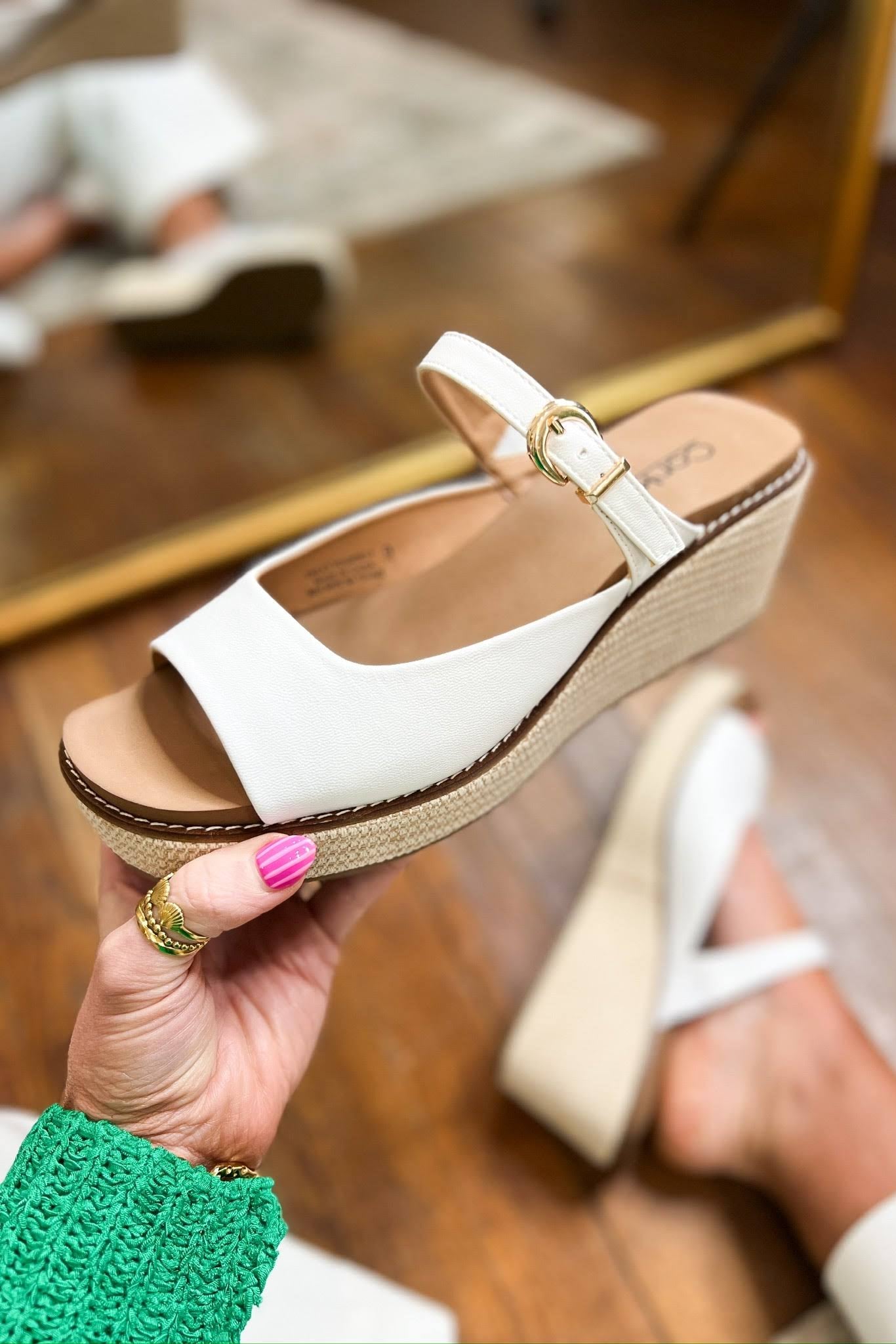 Go ahead — you deserve them. The Corkys Treat Yourself Wedges blend comfort and elevated style in the best way. Featuring a sleek open-toe design, a supportive slingback strap, and a statement buckle detail, these wedges are made for easy, confident wear. The wrapped platform wedge adds flattering height while keeping things lightweight and walkable. Finished with Corkys’ signature cushioned footbed, they’re perfect for workdays, weekend outings, or dressing up your favorite denim.