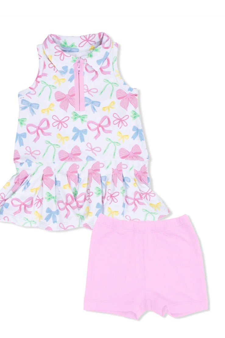 Provide both style and comfort with the Polo Tennis Dress and Cartwheel Short, crafted from high-quality Viscose derived from Bamboo. This ensemble is tailored for active infants, incorporating a sporty polo collar, a convenient front zipper for rapid dressing, and coordinating cartwheel shorts for unrestricted movement during playing, twirling, or tumbling activities.