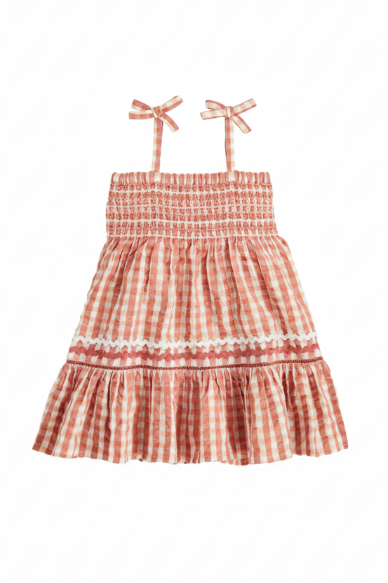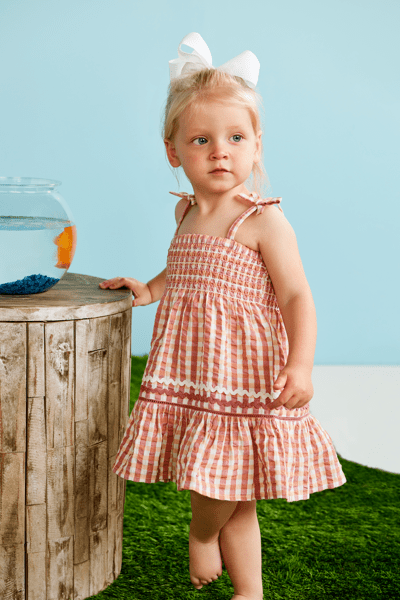 This sweet gingham dress brings timeless charm to your toddler's wardrobe. Made from 100% breathable cotton, it keeps little ones comfortable all day long. The smocked bodice creates a gentle, flexible fit, while bow shoulder straps and a ruffled hem trimmed with ric-rac and eyelet add playful details. The classic woven check pattern works for everything from everyday wear to special celebrations. Sized for infants 12-18 months (small), toddlers 2T-3T (medium), and 4T-5T (large).