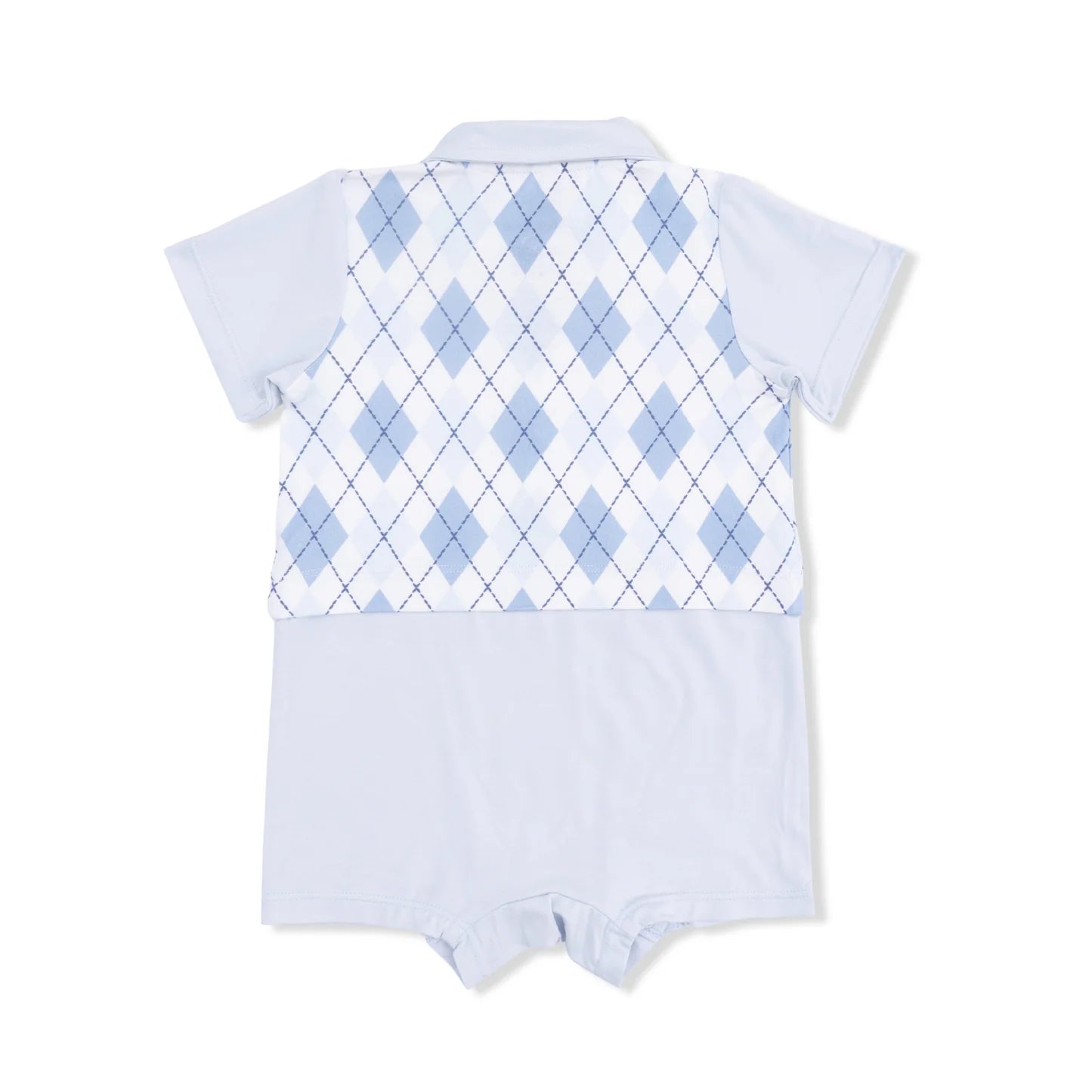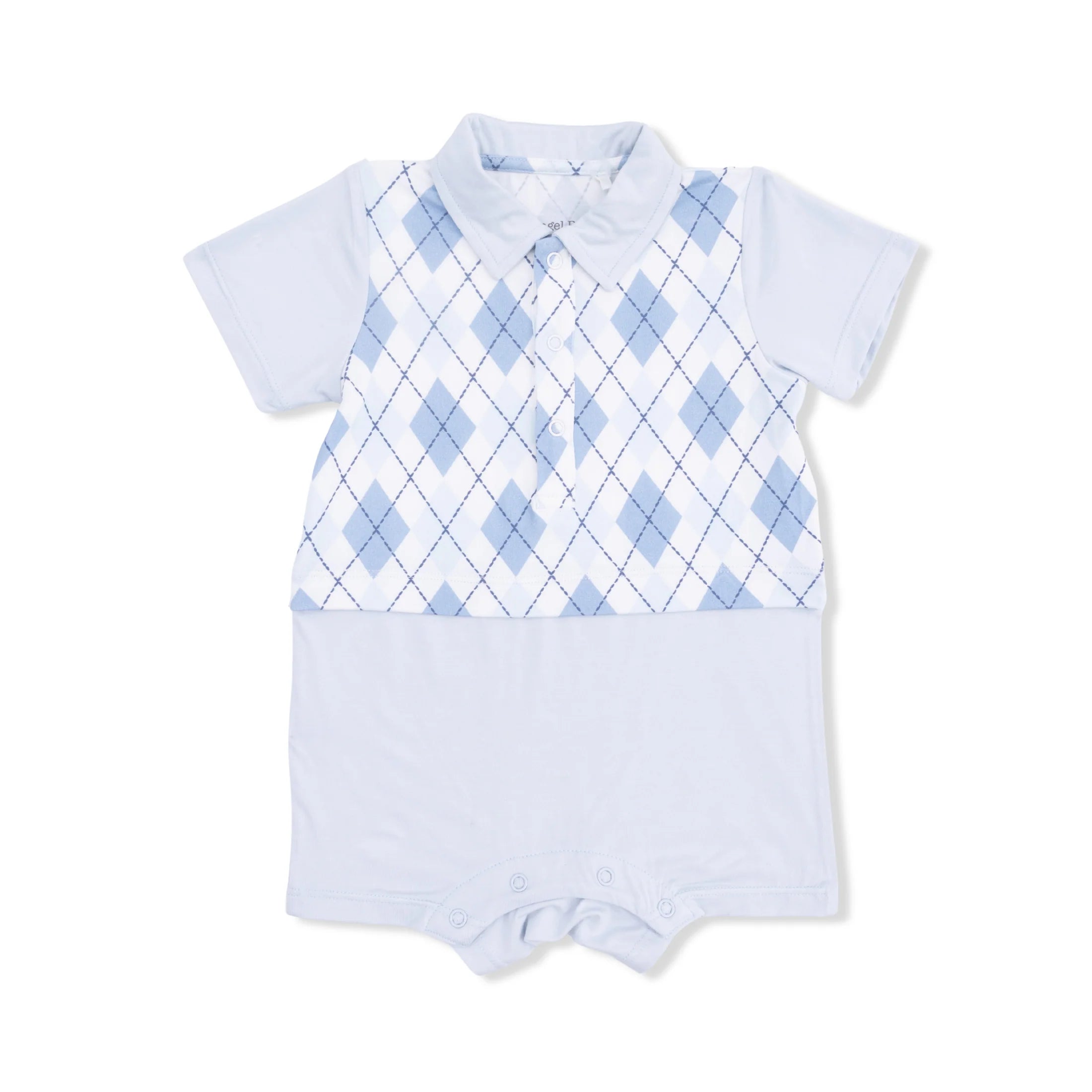 Little ones will love moving and playing in this charming blue argyle playsuit from Angel Dear. Crafted from silky bamboo viscose, it's breathable and gentle on delicate skin while keeping your baby cool during warm days. The classic polo collar brings a touch of sophistication to playtime, while convenient snap closures make diaper changes quick and easy. Whether your tot is crawling, napping, or striking a pose for photos, this cozy short playsuit offers the perfect blend of comfort and style. A versatile essential that works beautifully on its own or layered under a light sweater for cooler moments.