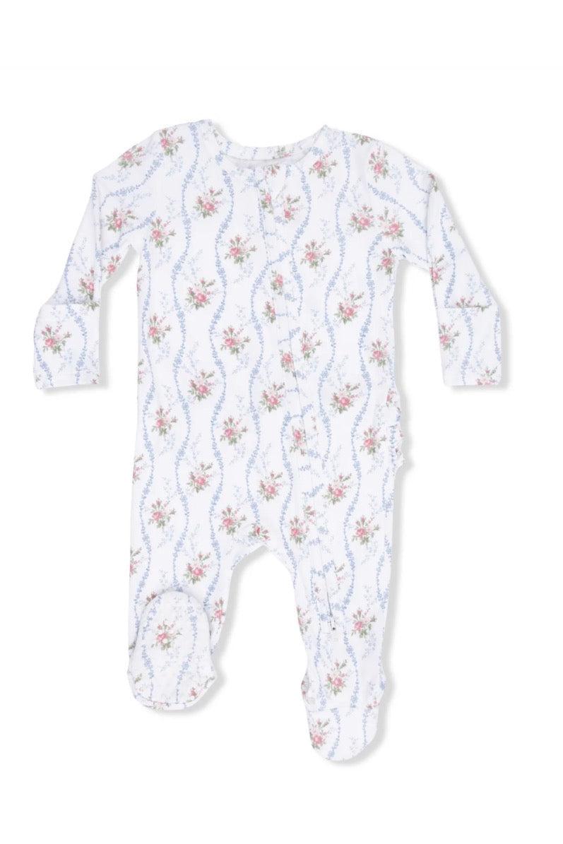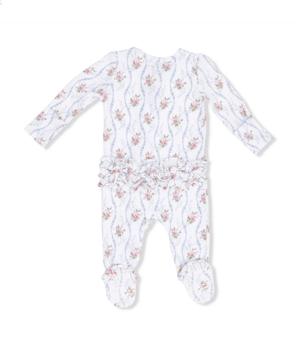 Snuggle your little one in pure comfort with this charming Ashley Heirloom Floral footie! Crafted from luxuriously soft bamboo viscose, it features a delightful ruffle back detail that adds personality to every outfit. The 2-way zipper makes diaper changes effortless, while the zipper guard protects delicate skin at the chin. Fold-over cuffs keep tiny hands safe from scratches, and non-slip grippers provide stability as your baby grows. Tagless and free from flame retardants, this footie is gentle on sensitive skin and naturally temperature-regulating. Angel Dear's signature floral print transforms bedtime into a picture-perfect moment. Perfect for newborns through 6-9 months.