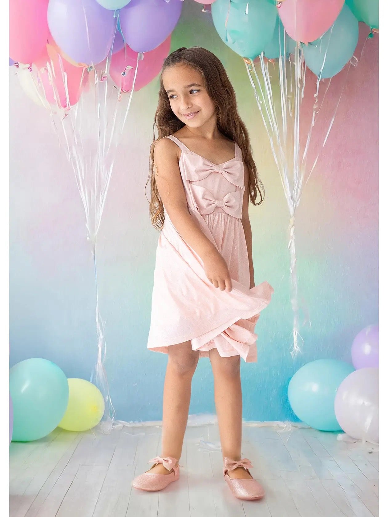 The Isobella & Chloe Ready To Twinkle Dress features a sleeveless design with decorative front bows and smocked detailing. Its lining ensures comfort for toddlers, while the shimmer adds a festive touch. This dress is ideal for special occasions, combining style and practicality for young girls.