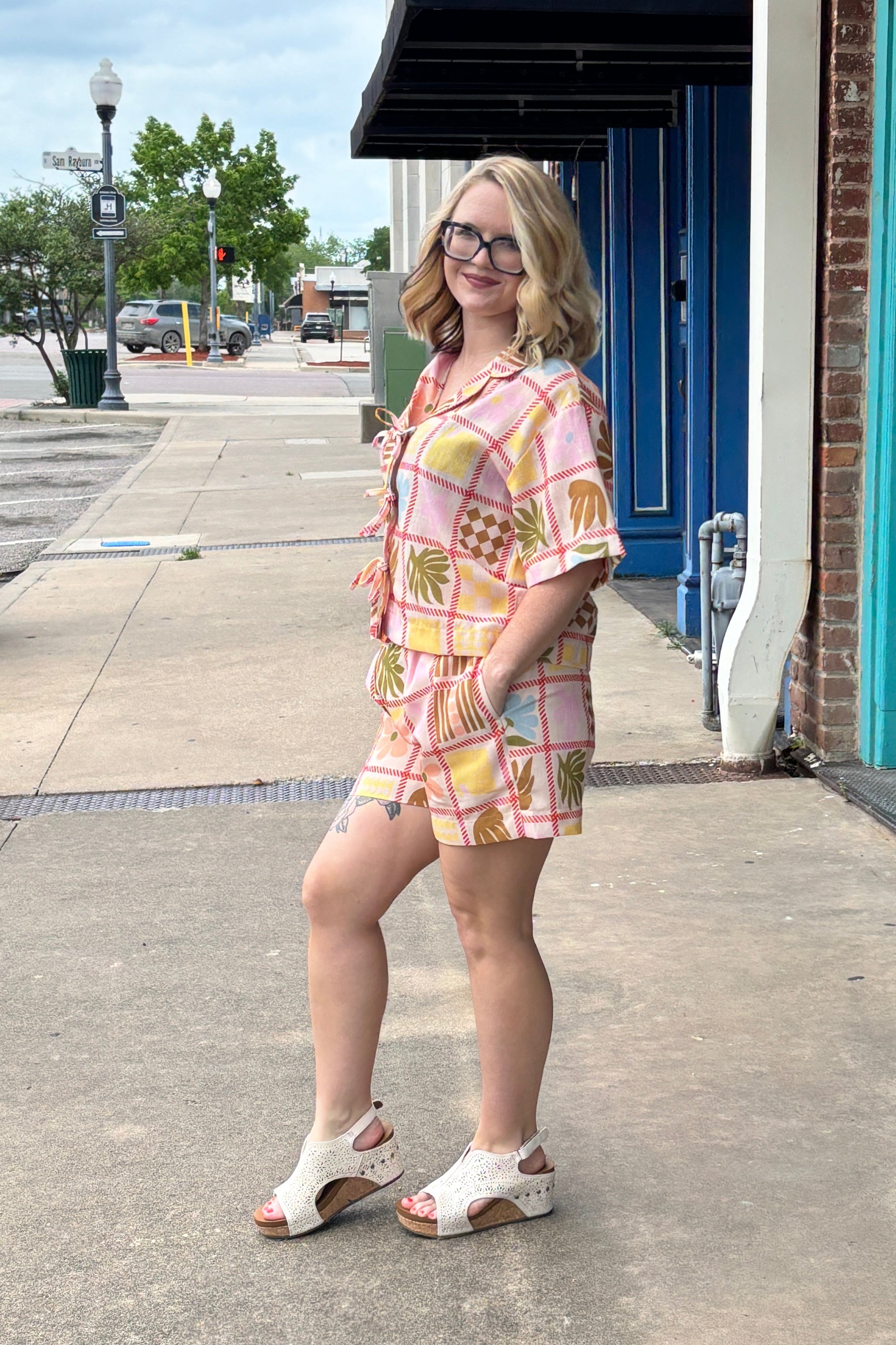 Unleash your whimsical side with the Almost Paradise Short Set! This playful set features a mixed tile print and a relaxed fit, making it both stylish and comfortable. The notched collar bow ties add a touch of quirkiness, while the stretch band waistband and side pockets provide convenience. Lightweight and perfect for any occasion!