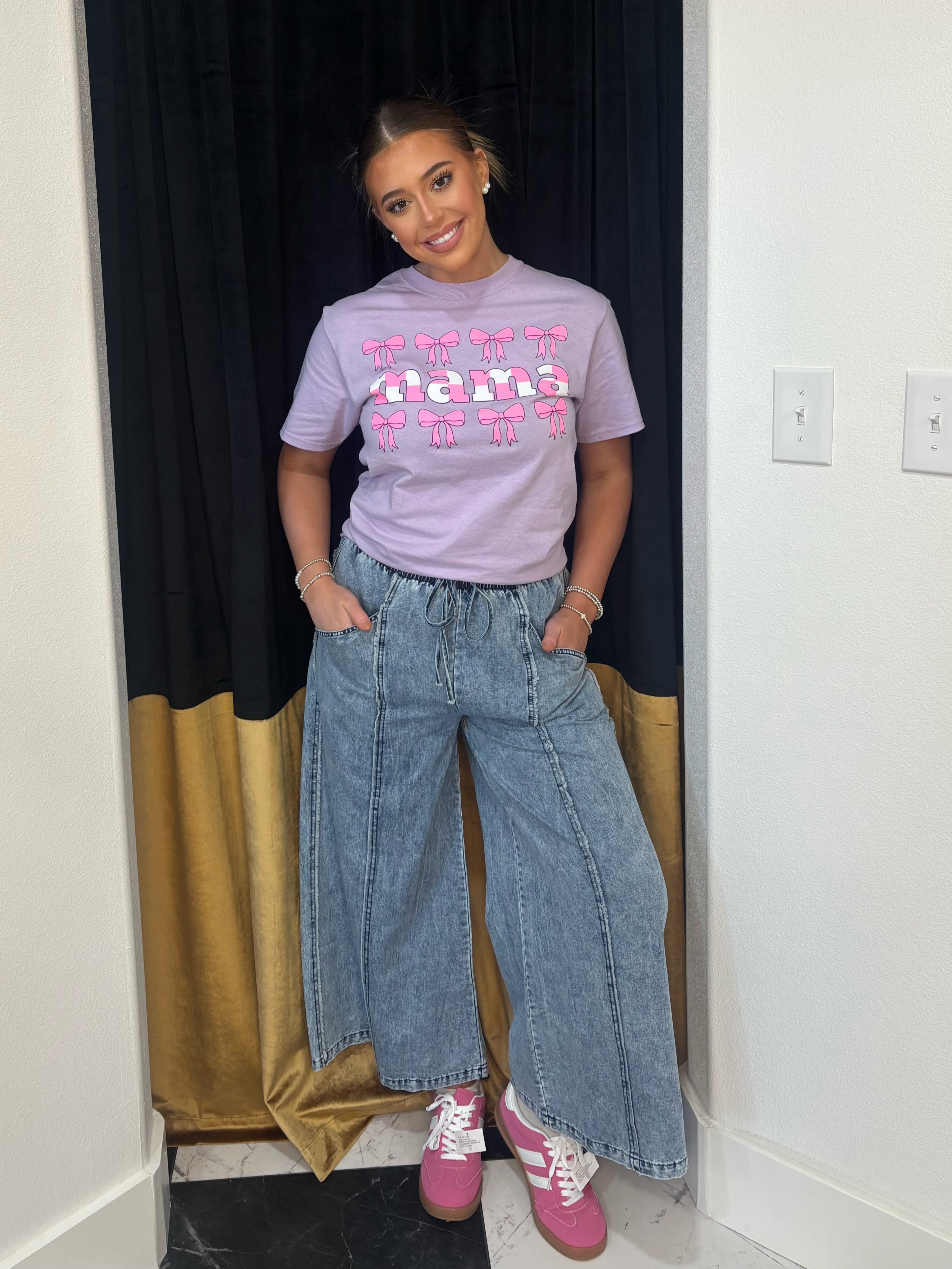 The Mama’s Got Bows Woman’s Graphic Tee features a lilac colorway, adorned with a pink and white checked "MAMA" surrounded by pink bows. Made from 100% cotton, this short sleeve tee ensures breathable comfort and durability, making it suitable for everyday wear while expressing a playful yet sophisticated style.