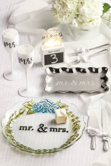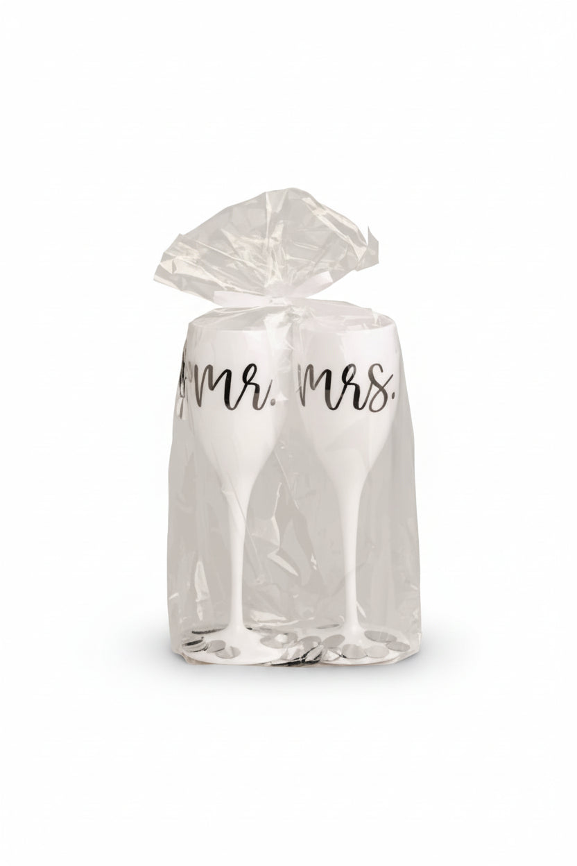 Celebrate love with this elegant Mr. & Mrs. Champagne Flute Set from Mud Pie. Crafted from premium shatterproof white acrylic, these sophisticated flutes feature timeless black script lettering and are perfect for weddings, receptions, and honeymoon celebrations. Durable and worry-free, they're ideal for outdoor events and poolside toasting. Each set arrives beautifully pre-wrapped in clear cellophane with silver confetti and a white ribbon, making it an effortless gift-ready choice for newlyweds.