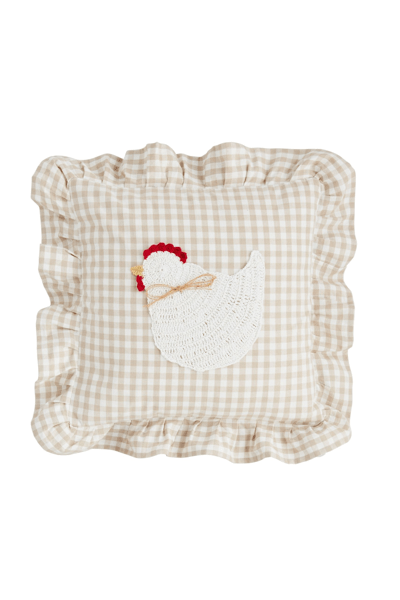 The Gingham Crochet Chicken Pillow is a charming and cozy addition to any home decor. This delightful pillow showcases a classic woven gingham pattern, adding a touch of timeless elegance to your space. The standout feature is the intricately crocheted chicken icon, which brings a playful and whimsical element to the design. The pillow is adorned with a ruffle flange, enhancing its visual appeal and providing a soft, textured edge. Crafted with a durable canvas backing, it ensures longevity and comfort. The convenient zipper closure allows for easy removal and cleaning. Measuring 21" x 21", this pillow is generously sized to offer both style and support. Made from 100% cotton, it promises a soft and breathable feel, making it perfect for cuddling up on a sofa, bed, or favorite chair.