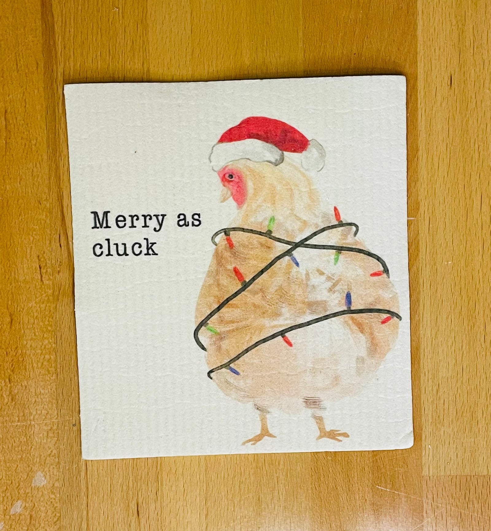 Whip up a festive and fun holiday atmosphere with MudPie's Christmas Sponge Towels! These reusable dish cloths feature a playful chicken design and the cheeky slogan, "merry as cluck." Get your kitchen merry and bright with this quirky and handy addition.