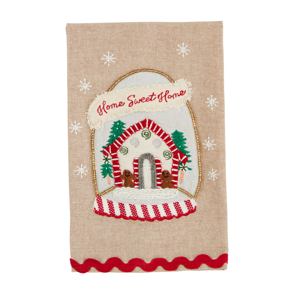Freshen up your kitchen with our playful and high-quality chambray dish towel. Adorned with a delightful appliqued design and intricate embroidery, this towel also features a scalloped ric-rac hem for a touch of whimsy. Measuring 21" x 14", it's perfect for drying hands or wiping up spills.