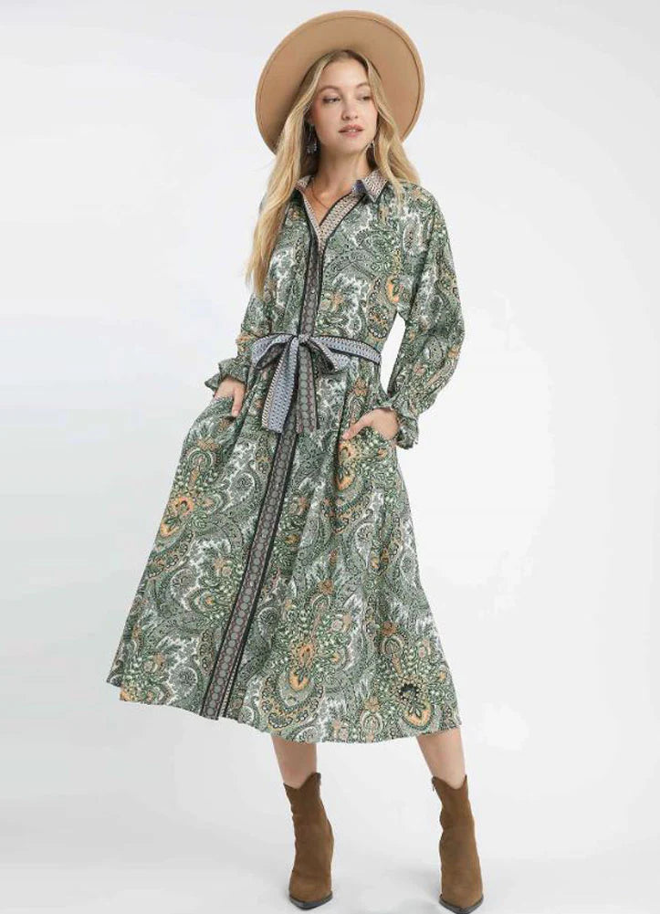 "Get ready to turn heads in our Paisley Mixed Print Midi Dress. This collared dress features a button front, delicate ruffle cuffs, and a belted waistband for a flattering fit. With the added convenience of side pockets, you can rock this dress in style while staying practical. The earthy tones add a touch of playfulness to this versatile piece.