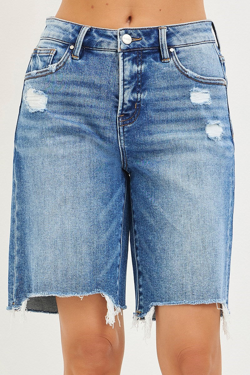 The Risen Slouchy Jean Shorts in Curvy are designed in a Bermuda style, offering moderate coverage with a flattering fit. Featuring tummy control for enhanced support, these shorts also include mild distress details and a frayed hem, combining comfort with a stylish aesthetic for versatile summer wear.