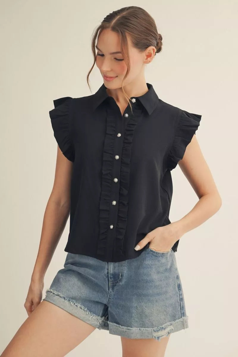 The Ruffles in Spring Women’s Top in Black, features a ruffled cap sleeve and a white pearl button-down ruffled front, enhancing both style and comfort. Its crinkled finish offers a textured appearance while the solid color provides versatility for various occasions. Ideal for sophisticated layering or standalone wear, this top merges functionality with fashion.