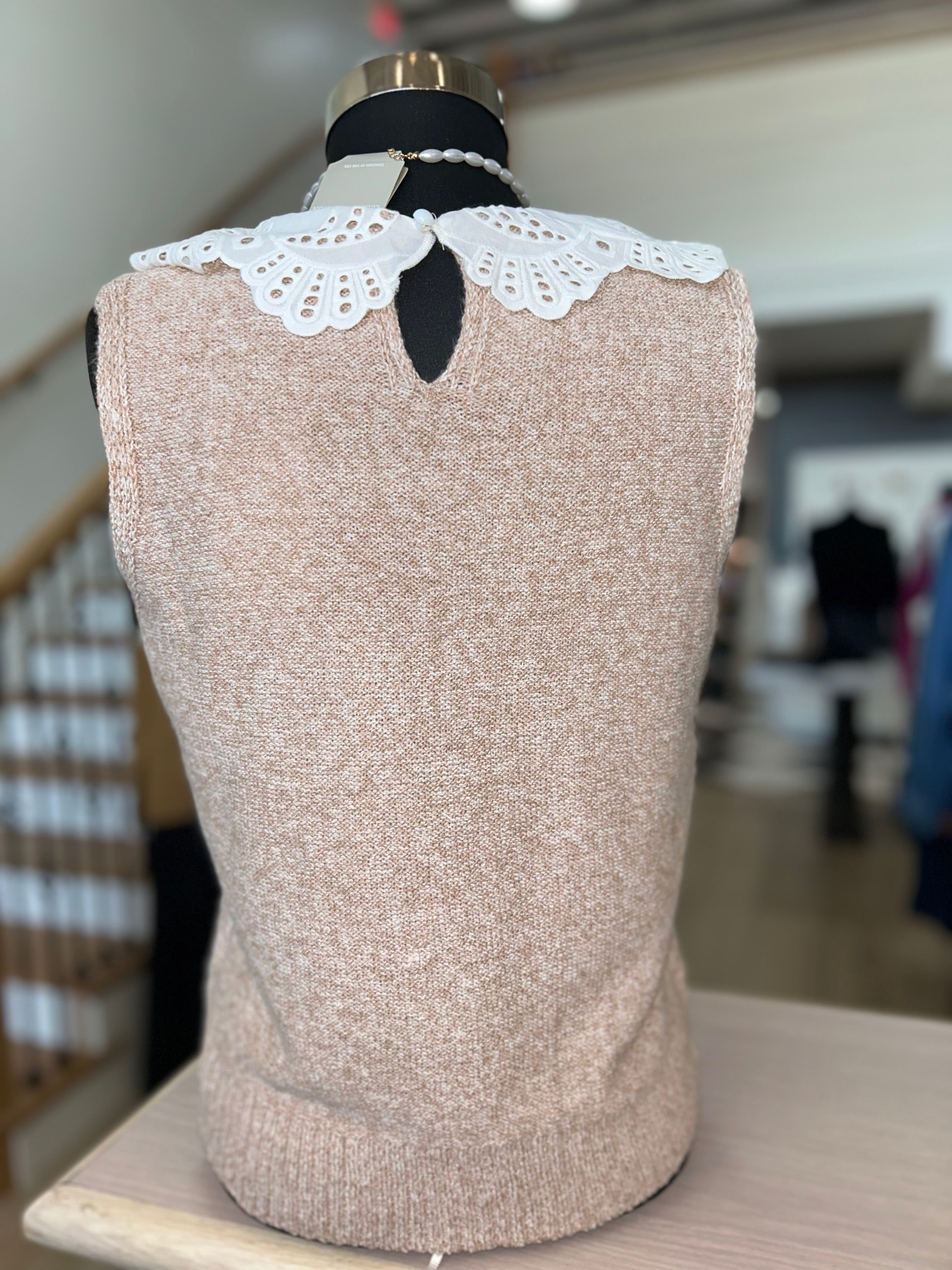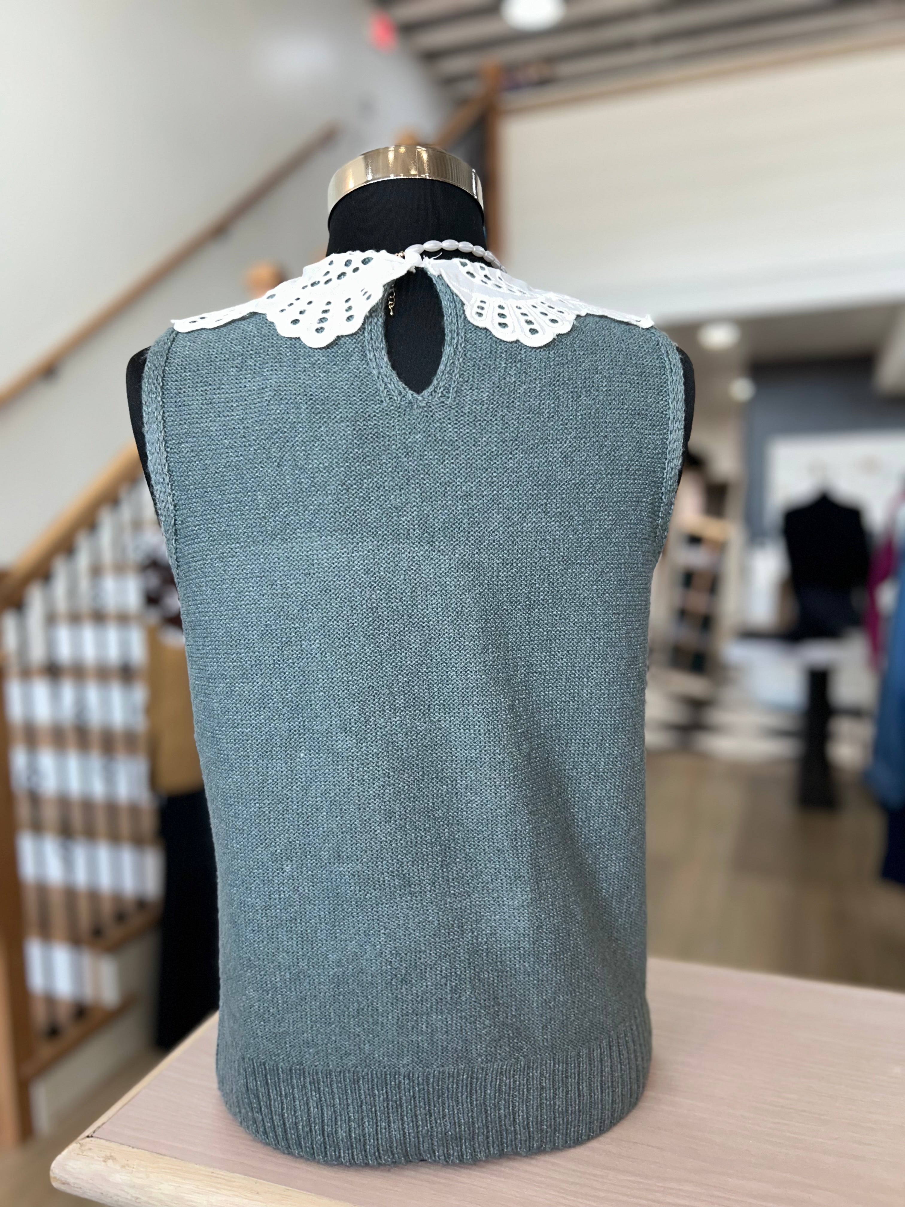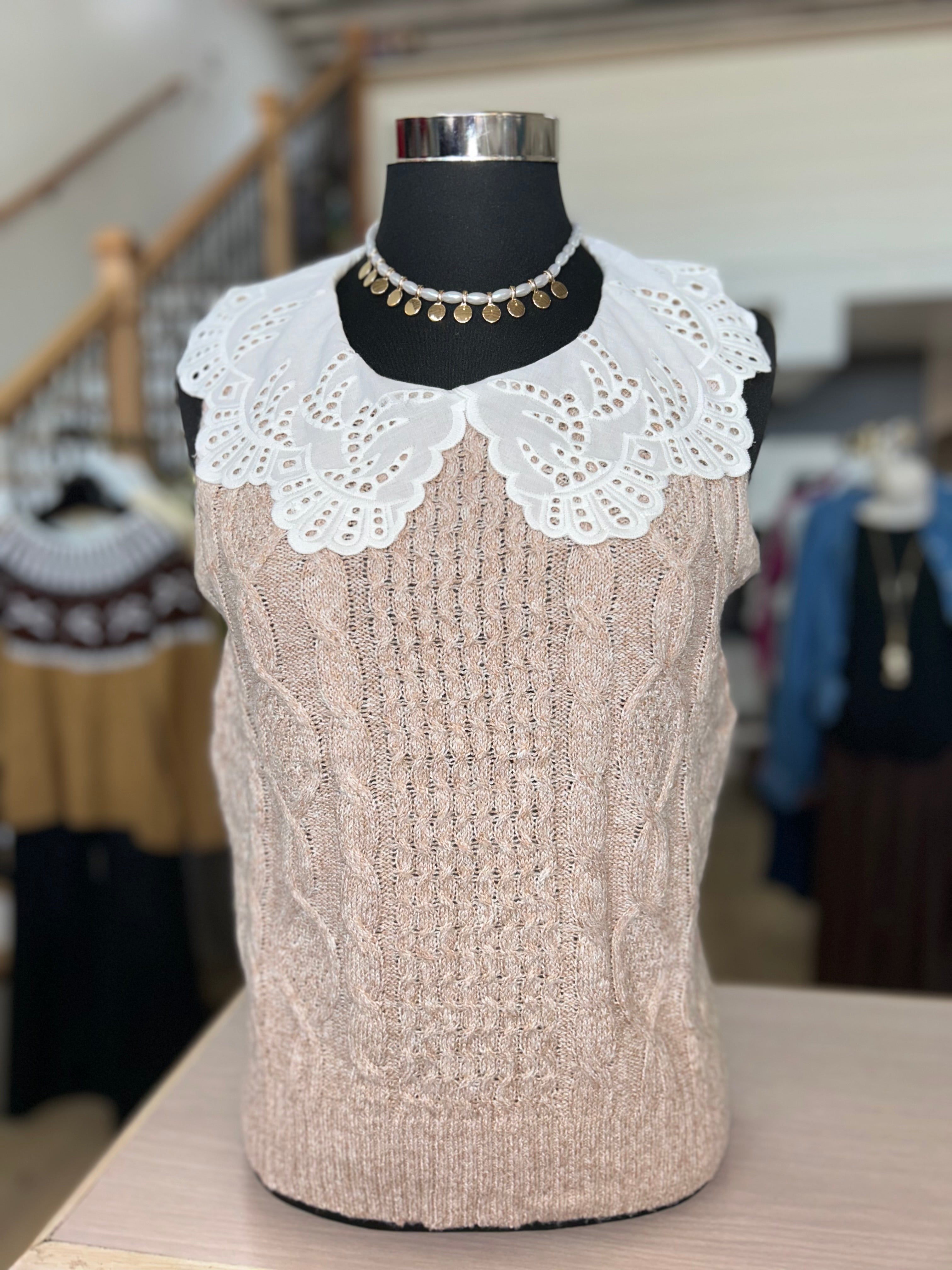 "Stay cool and stylish in our Sleeveless Comfort Woman's Vest! With knitted details on the bodice and a delicate white lace collar, this vest adds a touch of elegance to any outfit. Available in hunter green and taupe, it also features a convenient back button closure. Perfect for any fashion-forward woman looking for comfort and style.