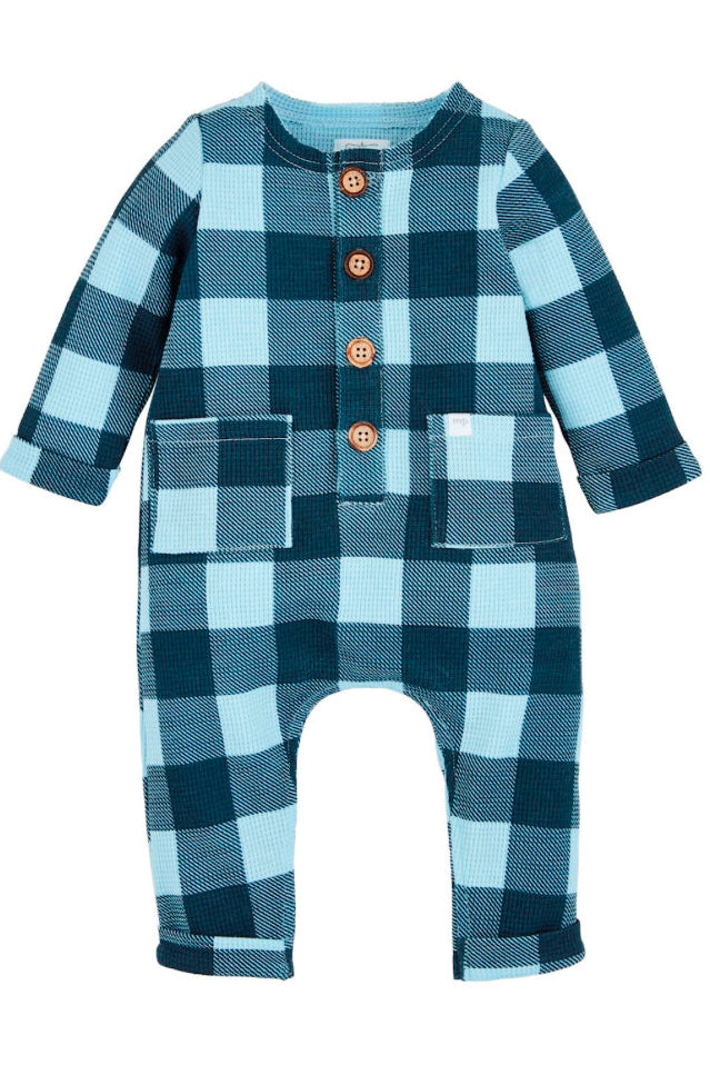 "Get ready to check off your list of must-have baby items with this adorable Mud Pie checkered romper! Featuring a classic blue plaid design, front pockets, and cuffed sleeves and hem accented with wooden buttons, your little one will look stylish and ready for any adventure. The perfect addition to any baby boy's wardrobe!